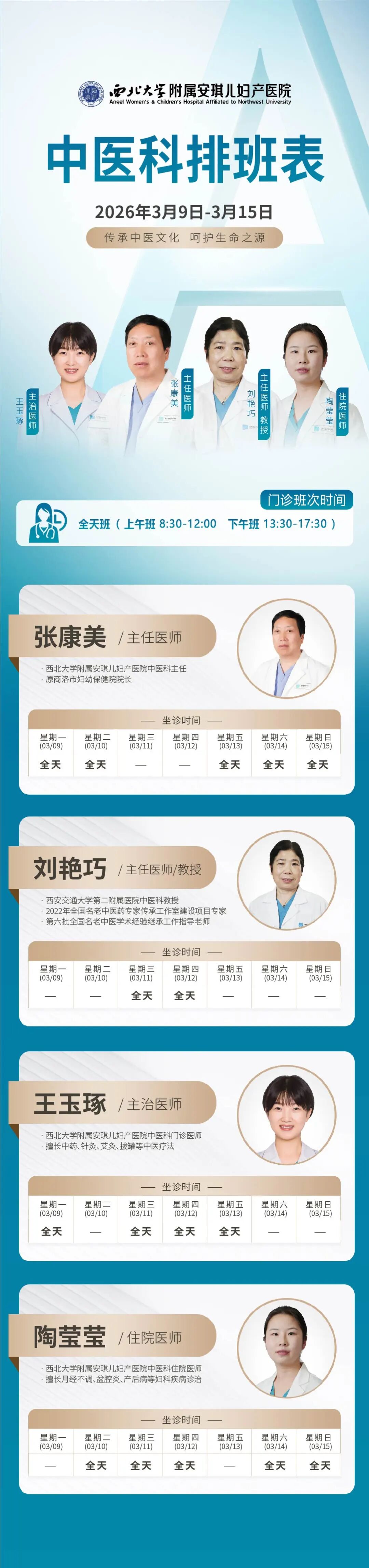 西安安琪儿妇产医院(3月9日至3月15日)专家坐诊时间表